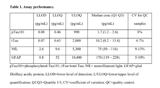 本研究評估了一組四種新的MSD超靈敏電化學(xué)發(fā)光(ECL)免疫分析方法(電化學(xué)發(fā)光免疫分析技術(shù)),針對血漿中推測的AD相關(guān)CNS衍生蛋白[磷酸化Tau181(pTau181)、總Tau(tTau)、神經(jīng)絲輕鏈(NfL)和膠質(zhì)纖維酸性蛋白(GFAP)]。對來自哈佛醫(yī)學(xué)院馬薩諸塞州阿爾茨海默病研究中心縱向隊(duì)列研究的366份血漿樣本進(jìn)行了檢測,以區(qū)分明確的AD、其他神經(jīng)退行性疾。∣ND)和認(rèn)知正常(CN)個(gè)體。選擇一部分樣本進(jìn)行縱向隨訪,以確定該血漿生物標(biāo)志物小組在預(yù)測不同認(rèn)知障礙水平個(gè)體認(rèn)知下降4年風(fēng)險(xiǎn)方面的效用。
