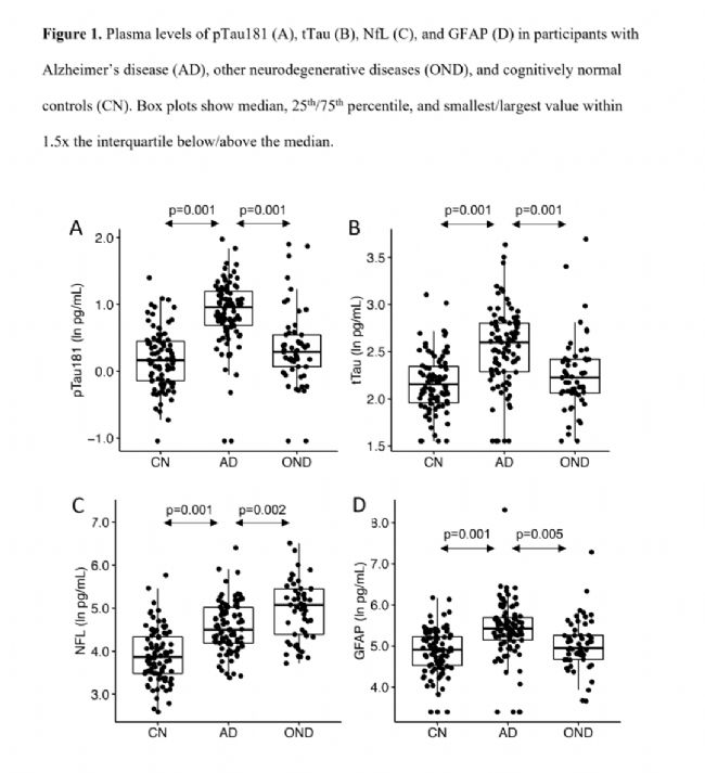 結(jié)果:AD組pTau181、tTau和GFAP高于CN和OND組,而NfL在AD組升高,在OND組進(jìn)一步升高。pTau181表現(xiàn)最好(AD vs CN:AUC=0.88,增加2倍;AD vs OND:AUC=0.78,增加1.5倍),但tTau也表現(xiàn)出極好的辨別力(AD vs CN:AUC=0.79,增加1.5倍;AD vs OND:AUC=0.72,增加1.3倍)。