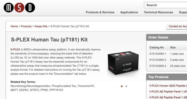 本研究提供了II類證據(jù),證明血漿pTau181、tTau、NfL和GFAP水平與AD相關(guān),pTau181和GFAP與MCI進(jìn)展為AD癡呆相關(guān)。本研究使用了MSD的S-plex Tau(181), Tau(total)試劑盒,以及特別定制的Prototype S-plex NfL和GFAP試劑盒。