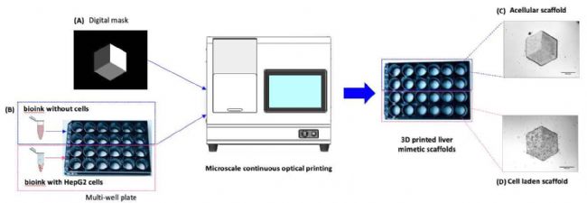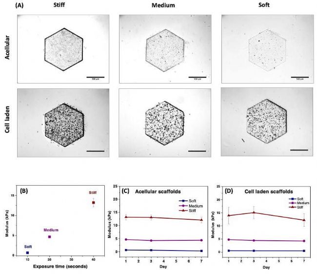 上為打印流程的示意圖。將裝有生物墨水的多孔板放入BIONOVA X,進行全自動的高通量打印。A中模型文件可看出三種不同顏色,分別對應了不同的曝光程度,依照其進行打印,最終得到C、D所示的打印產(chǎn)物。打印C使用的生物墨水沒添加細胞,能明顯看出三種不同的顏色,與A中圖案匹配,而不同顏色對應的硬度也是不同的;D同理,D所使用的生物墨水含有HepG2細胞,來源為健康的3月齡約克夏豬。