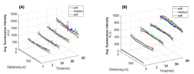 A、B分別使用了4.4kDa和60-85kDa的分子。不同硬度的打印產(chǎn)物中,分子擴散相似,表明此研究中硬度不影響分子擴散。