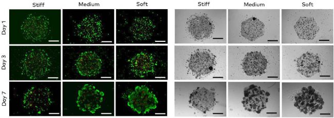 這些特性使得BIONOVA X能輕松的為細胞制備不同的細胞環(huán)境,以觀察細胞生長增殖的差異;更進一步,還可以制備多種環(huán)境并存的樣本,研究細胞在不同環(huán)境間的遷移。此研究就發(fā)現(xiàn)了高硬度限制了干細胞的增殖和生產(chǎn),但增強了其遷移和入侵的能力。