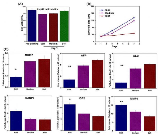 基因表達分析為打印后7日所測。增殖標記MKI67、AFP、ALB,在硬度低和中的樣本里表達量相近,而硬度高的樣本則顯著低于兩者;凋亡標記CASP8相反。另外,胰島素相關(guān)因子IGF2表達量,硬度高的樣本顯著高于其它。最后,與肝細胞癌腫瘤侵襲、轉(zhuǎn)移、復發(fā)高度相關(guān)的MMP9標記,顯示出硬度越高,其表達量越高。