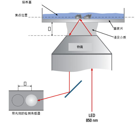 圖3:自適應(yīng)對焦控制(AFC)也可以在長時間延時采集期間自動穩(wěn)定顯微鏡焦點。傳感器檢測到LED光束(850 nm)的運動,如果載有樣本的蓋玻片改變其位置,例如由于熱活動,就會發(fā)生這種運動。