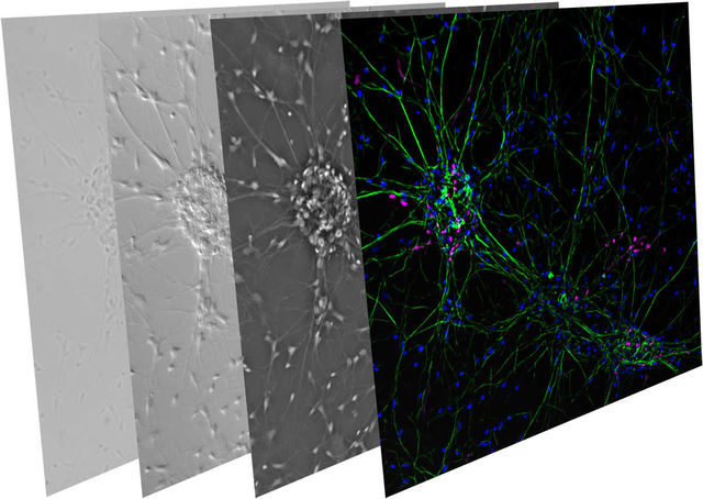 圖4:用不同對比方法獲得的一系列神經(jīng)元細胞。從左到右:明場、DIC、相襯、熒光