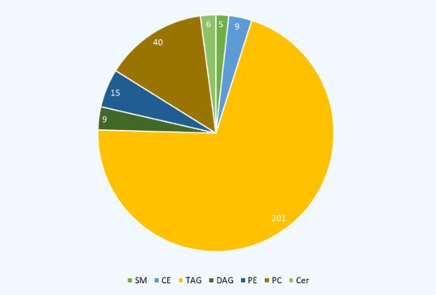 該方法提供了眾多的多反應(yīng)監(jiān)測(Multiple reactions monitoring, MRM)離子對用于多種脂類物質(zhì)的靶向檢測;衔锪斜碇锌梢詸z測約1900種脂質(zhì)分子,可以充分覆蓋哺乳動物的血漿、組織和細(xì)胞中的常見脂質(zhì)。另外,針對特定的待測物質(zhì),也可直接在MRM列表中添加其它想要檢測分析的脂質(zhì)化合物離子對。在分離的微量細(xì)胞中共檢測到285個脂質(zhì)化合物,包括鞘脂SM、膽固醇酯CE、甘油三酯TAG、甘油二酯DAG、磷脂酰乙醇胺PE、磷脂酰膽堿PC、神經(jīng)酰胺Cer7類(圖3)。