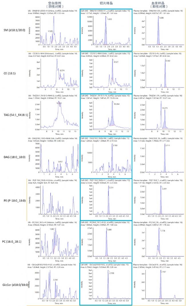 圖4. 微量腦組織切片中測得的脂質(zhì)化合物示例圖。通過LC-MS/MS測得的7類脂質(zhì)化合物在空白提取溶劑中(左)均不存在,而與陽性對照血漿樣本(右)中出峰行為一致。
