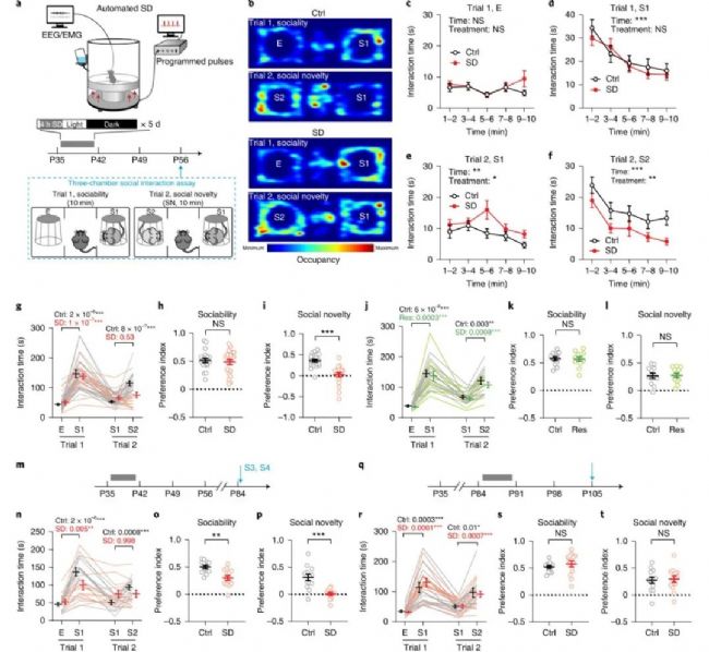 為了研究青少年時(shí)期的SD是否會(huì)影響成年后的社交行為,作者利用自動(dòng)睡眠剝奪系統(tǒng)來(lái)干擾動(dòng)物的睡眠,并通過(guò)三箱社交實(shí)驗(yàn)來(lái)檢測(cè)動(dòng)物的社交能力和社交新奇偏好。研究結(jié)果顯示,青春期SD不會(huì)影響小鼠的社交能力,但是會(huì)損害小鼠的社交新奇偏好。這種社交新奇偏好的缺陷不是由于與睡眠剝奪相關(guān)的慢性壓力造成的,因?yàn)樵谇啻浩诘穆允`壓力并沒(méi)有導(dǎo)致類似的缺陷。青春期SD對(duì)社交新奇偏好的影響持續(xù)時(shí)間較長(zhǎng),在初次實(shí)驗(yàn)4周后仍然能夠檢測(cè)檢測(cè)到SD小鼠社交新奇偏好缺陷。將同樣的SD方案應(yīng)用于成年小鼠并不能導(dǎo)致動(dòng)物社交能力或社交新奇偏好方面的任何缺陷,這表明社交新奇偏好要求小鼠在青春期的睡眠不受干擾,而非成年時(shí)期。