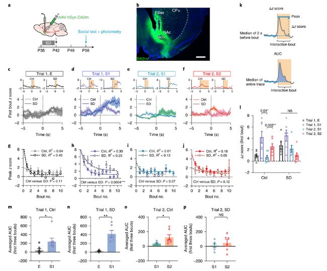 VTA多巴胺能神經(jīng)元在處理社會(huì)獎(jiǎng)勵(lì)和調(diào)節(jié)社交行為方面的作用依賴于它們?cè)谥衅拥南掠瓮渡,包括伏隔核(Nucleus Accumbens, NAc)和前額葉皮層(Prefrontal Cortex, PFC)。為了檢測(cè)NAc是否是青春期SD引發(fā)社交障礙的靶點(diǎn),作者利用多巴胺探針傳感器來(lái)直接測(cè)量NAc中的多巴胺釋放,結(jié)果顯示,NAc中的多巴胺釋放與VTA神經(jīng)元反應(yīng)模式一致。SD小鼠遇到第一次社交刺激時(shí),NAc中的多巴胺釋放異常升高,而在遇到第二次新的社交刺激時(shí),NAc中的多巴胺釋放信號(hào)受損。