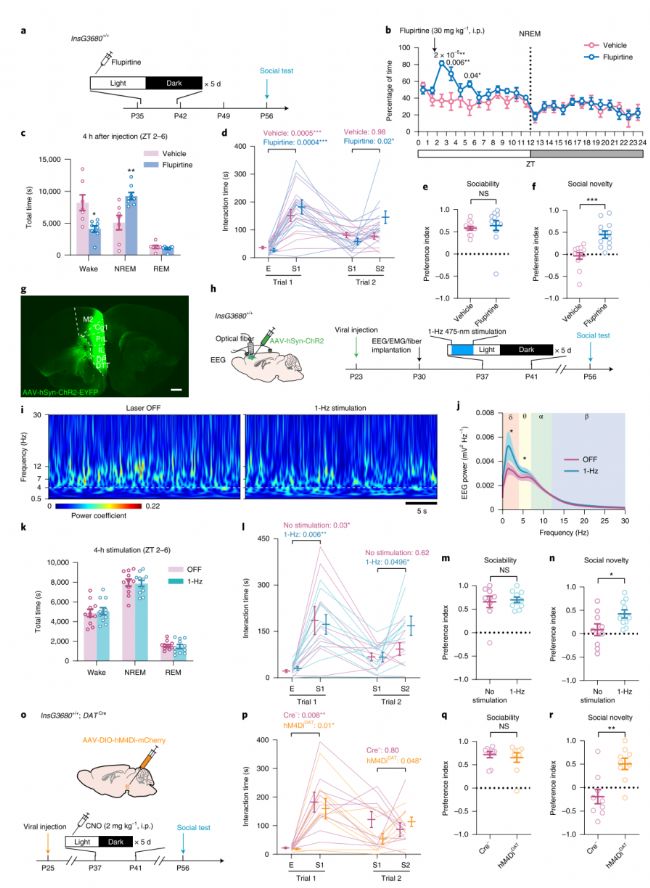 在確定了持續(xù)干擾青春期睡眠會(huì)損害社交新奇偏好、VTA-NAc環(huán)路的社交新奇性反應(yīng)以及成年后VTA投射輪廓后,作者想進(jìn)一步了解睡眠異常是否會(huì)在青春期自發(fā)地發(fā)生在神經(jīng)發(fā)育障礙動(dòng)物模型中,以及恢復(fù)青春期睡眠是否可以挽救這些動(dòng)物的社交缺陷。為此,作者使用了一個(gè)自閉癥小鼠模型(InsG3680+/+小鼠)。與同窩野生型小鼠相比,InsG3680+/+小鼠清醒時(shí)間更多,非快速眼動(dòng)睡眠更少,在NAc中的多巴胺能神經(jīng)支配增加,VTA軸突表型類似于青春期SD小鼠以及異常的VTA興奮。接下來(lái),作者利用氟吡汀來(lái)糾正InsG3680+/+小鼠的青春期睡眠缺陷。氟吡汀顯著增加了InsG3680+/+小鼠非快速眼動(dòng)的時(shí)間,降低了清醒時(shí)間,使得小鼠睡眠時(shí)間的完全補(bǔ)償達(dá)到了與野生型小鼠相當(dāng)?shù)乃。重要的是,在青春期給予氟吡汀的InsG3680+/+小鼠,其社交新奇偏好完全恢復(fù)。此外,作者在不改變睡眠/清醒狀態(tài)總時(shí)間的情況下,通過(guò)增加InsG3680+/+小鼠特定的睡眠成分(皮層慢波活動(dòng),SWA),完全恢復(fù)了小鼠的社交新奇偏好。由于抑制VTA活動(dòng)可拯救青春期SD小鼠的社交缺陷,作者進(jìn)一步通過(guò)化學(xué)遺傳學(xué)抑制了InsG3680+/+小鼠青春期VTA的活動(dòng),小鼠的社交缺陷得以恢復(fù)。因此,作者證明了改善非快速眼動(dòng)睡眠以及減少青春期關(guān)鍵期VTA活動(dòng)可以恢復(fù)自閉癥小鼠的社交新奇偏好。