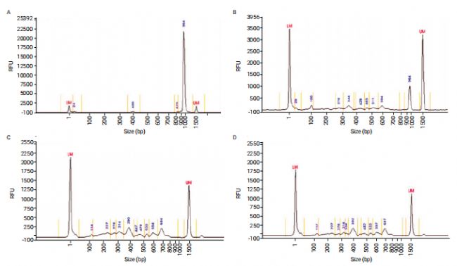 圖 5 PCR擴(kuò)增子片段到350~500bp大小,以獲得合適的測(cè)序樣本。使用安捷倫片段分析儀系統(tǒng)來評(píng)估碎片化的程度。(A)非片段PCR擴(kuò)增子在964bp。(B)超聲打斷 C和D重復(fù)超聲打斷技術(shù),顯示出廣泛的片段模式,峰值約為390bp,是下游測(cè)序的理想選擇