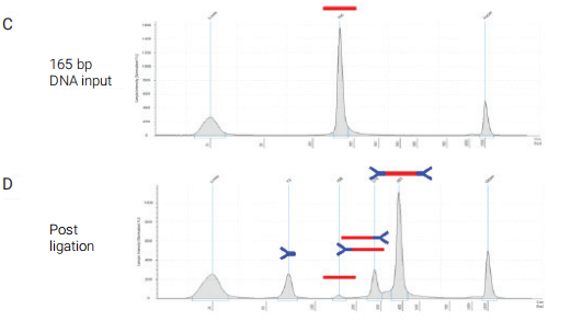 圖 6 使用安捷倫Tapestation系統(tǒng)的進(jìn)行接頭連接的QC。(A)input DNA(紅色)和接頭(藍(lán)色)示意圖 (B)接頭在75bp處有一個(gè)峰值 (C)input DNA在165bp (D)以B和C為參考,四個(gè)峰值:接頭,input DNA,單端接頭,雙端接頭 (E)加號(hào)接頭的文庫最終產(chǎn)物和(F)pcr后帶有雙端接頭DNA插入片段示意圖
