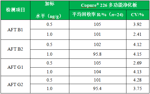 逗點生物采用24孔Copure® 226多功能凈化板,實現(xiàn)了黃曲霉毒素的快速、高通量檢測。建立玉米粉中黃曲霉毒素B1、B2、G1、G2檢測的LC-MS/MS檢測方法。兩個水平(0.5.ng/g,1.0 ng/g)的加標(biāo)回收率均在90-110 %之間,孔間回收率CV值小于5 %。
