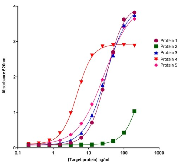 2.樣本:5個(gè)純化his標(biāo)記的重組羊駝VHH抗抗原X抗體(Protein 1-5),連續(xù)稀釋20 ng (100 ul @ 200 ng/ml); 1:2穿過(guò)盤子。