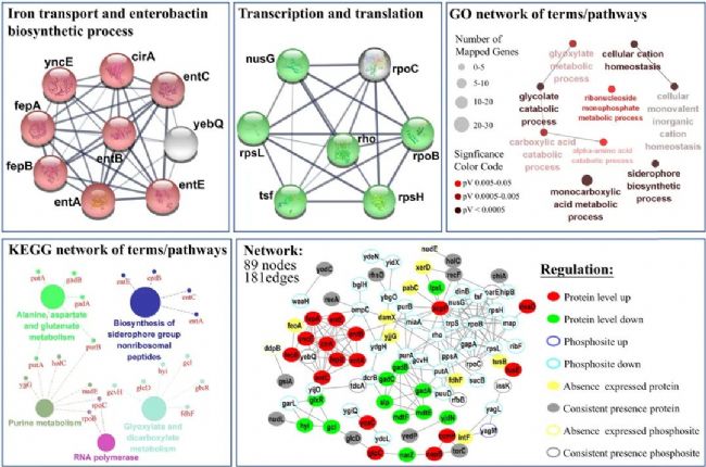 為了解析nTiO2促進生物膜形成的機制,研究選取大腸桿菌分析了nTiO2暴露引起的蛋白表達及磷酸化修飾層面的變化。蛋白質組學及磷酸化修飾組分別鑒定到2937個蛋白和350個磷酸化肽段和741個修飾位點。GO和KEGG分析顯示,上調(diào)表達的蛋白中顯著富集鐵轉運和維持鐵穩(wěn)態(tài)相關通路,以及核糖體蛋白和RNA聚合酶亞基蛋白。這些結果表明,nTiO2脅迫影響了細菌對鐵元素的利用,增強了RNA轉錄和蛋白翻譯過程,可能影響細菌對轉錄和蛋白質合成抑制類抗生素的耐藥性。