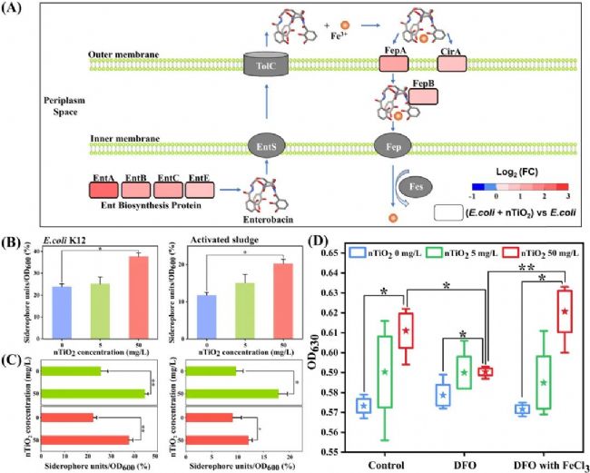 通過對暴露于50mg/L nTiO2下的大腸桿菌生物膜進行蛋白質組學分析,發(fā)現(xiàn)對鐵元素有高親和力的大腸桿菌素合成蛋白以及鐵元素轉運蛋白表達上調(diào)明顯,研究者猜測nTiO2促進細菌對鐵的利用來增強對環(huán)境的適應性。因此,研究人員利用三價鐵螯合物來驗證鐵元素對nTiO2脅迫下生物膜生長的影響。實驗表明,外源鐵螯合劑干擾了細菌對鐵的吸收,破壞了生物膜的發(fā)育,這進一步證明了nTiO2通過增強鐵的吸收促進生物膜的生成。