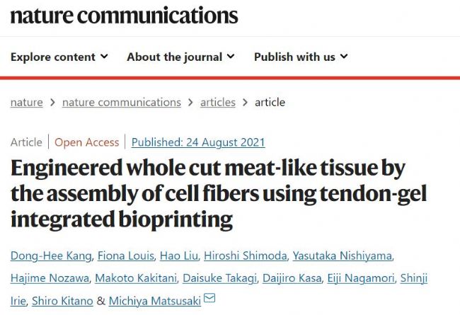 大阪大學(xué)Michiya Matsusaki教授發(fā)表了用三種原代牛干細(xì)胞誘導(dǎo)成并生物打印的組織(肌肉、脂肪和血管)組裝成的牛排樣組織的文章。生物打印的組織是連接到肌腱組織的排列組合。這項(xiàng)研究通過(guò)肌腱-凝膠集成生物打印技術(shù)(TIP)構(gòu)建了總共72條纖維,包括2條毛細(xì)血管、28個(gè)脂肪組織42塊肌肉和,組裝制成長(zhǎng)10毫米、寬5毫米的牛排狀肉。這種技術(shù)可以成為構(gòu)建使用不同細(xì)胞按所需位置、不同成分比例和多種纖維組織的人造肉的方法,用于未來(lái)肌肉組織工程。