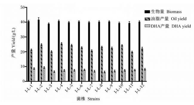 ▲圖5丨復合篩選裂殖壺藻藻株生物量、油脂產(chǎn)量、DHA產(chǎn)量測定