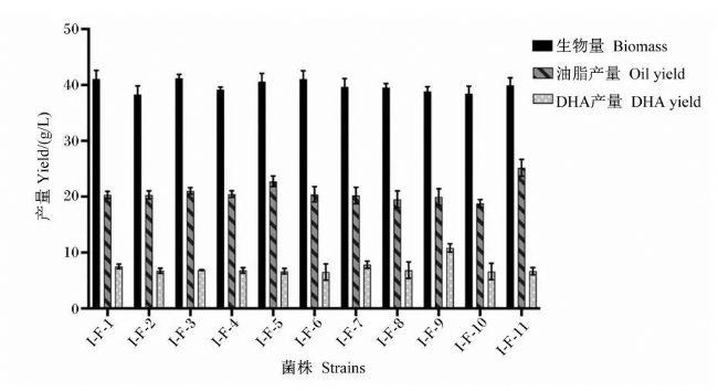 由此可見,通過ARTP選育的裂殖壺藻藻株I-F-9 較原始藻株 DHA 含量及產(chǎn)量均有顯著提高,且其 DHA 產(chǎn)量處于目前同類研究前列。