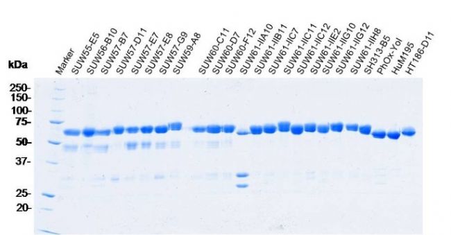 5. 使用酶標(biāo)儀在 450 nm 處針對(duì) 620 nm 的參考波長(zhǎng) (A 450 -A 620 )測(cè)量吸光度。此外,在無(wú)血清培養(yǎng)條件下在 HEK293-6E 細(xì)胞中產(chǎn)生的重組蛋白在考馬斯染色后通過(guò) SDS-PAGE 進(jìn)行定量。 在還原條件下制備樣品,并使用分析軟件與純化的標(biāo)準(zhǔn)蛋白質(zhì)進(jìn)行比較。