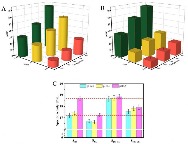 實(shí)驗(yàn)首先選擇枯草芽孢桿菌168作為DPEases異源表達(dá)底盤(pán)細(xì)胞,分別表征了pH和溫度對(duì)純化酶活性和穩(wěn)定性的影響。純化酶PSDPEase受溫度變化影響顯著,RCDPEase則具有更好的熱穩(wěn)定性。RCDPEase的活性受到pH變化的顯著影響,而DSDPEase的活性受到的影響較小。然而當(dāng)使用DSDPEase催化果糖合成D-阿洛酮糖時(shí),發(fā)現(xiàn)反應(yīng)混合物發(fā)生非酶褐變,并隨著pH逐漸變?yōu)閴A性會(huì)越來(lái)越明顯。