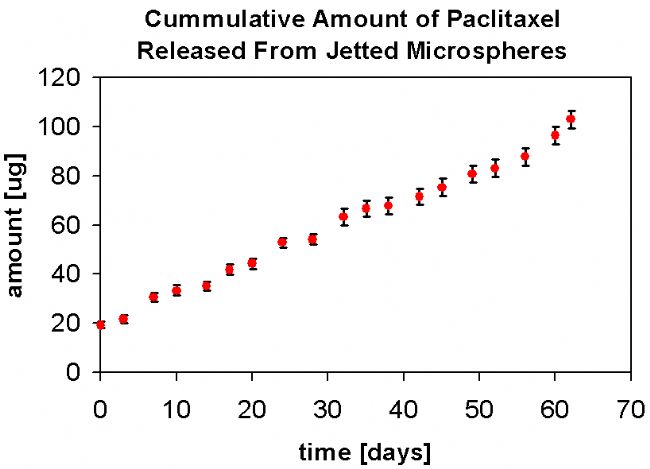 使用MicroFab的Inkjet技術(shù)制備的微球囊,可控粒徑范圍為15~100μm。研究顯示,采用該系統(tǒng)制備的載紫杉醇微球,對所載的紫杉醇分子本身無破壞,保證了藥物的治療效果,包封率至少可達(dá)67%,且粒徑均勻,藥物釋放緩慢。研究表明,噴墨技術(shù)生產(chǎn)的微球能夠持續(xù)釋放超過50天,可有效抑制和逆轉(zhuǎn)腫瘤的生長。