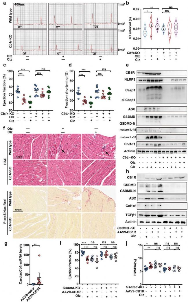 為驗(yàn)證CB1R在AP藥物誘導(dǎo)的焦亡和心臟毒性中的作用,作者將Cb1r基因敲除,研究發(fā)現(xiàn)Olz和Clz刺激后,Cb1r敲除小鼠表現(xiàn)為正常心功能,未表現(xiàn)出心臟重塑、纖維化組織積累等。而當(dāng)Cb1r基因過表達(dá)時,則相反,影響了心臟功能。