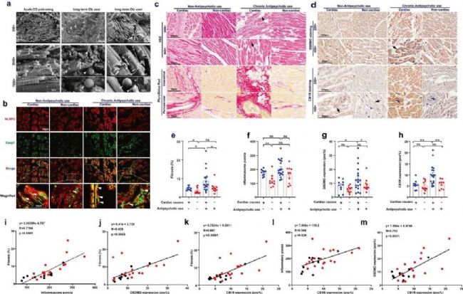 最后作者在人心臟標(biāo)本中評估了CB1R調(diào)節(jié)NLRP3炎性小體的臨床轉(zhuǎn)化潛能。在真實(shí)的尸檢病例中,長期使用Clz或Olz的患者心臟中,有顯著的NLRP3炎性小體斑點(diǎn)、大量纖維組織積累,且NLRP3炎性小體斑點(diǎn)的數(shù)量或GSDMD表達(dá)量與心臟纖維化程度顯著相關(guān)、CB1R表達(dá)與纖維化程度、NLRP3炎性小體數(shù)目和GSDMD表達(dá)也具有良好的相關(guān)性。綜上所述, CB1R的異常表達(dá)與抗精神病藥物誘導(dǎo)的人類心臟細(xì)胞焦亡和纖維化相關(guān)。