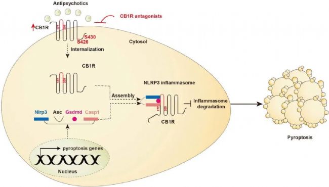 本研究發(fā)現(xiàn)NLRP3炎性小體介導(dǎo)的焦亡是AP藥物誘發(fā)心臟毒性的主要因素。NLRP3炎性小體的活性受CB1R控制,CB1R通過S426和S430內(nèi)化,并通過其177-209區(qū)域與NLRP3炎性小體發(fā)生物理相互作用,導(dǎo)致NLRP3炎性小體穩(wěn)定,并激活細(xì)胞焦亡,最終導(dǎo)致AP藥物的心臟毒性。此外,實(shí)驗(yàn)證實(shí)CB1R的抑制劑可保護(hù)小鼠免受AP藥物的心臟毒性且不引起額外的副作用。