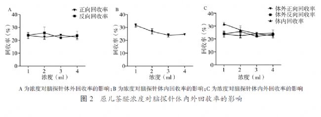 探針回收率可用正、反透析法來測定。其中正透析法可以說明探針的真實(shí)回收率,反透析法則可顯示體內(nèi)回收率與真實(shí)回收率的統(tǒng)一性。研究選擇正透析和反透析2 種實(shí)驗(yàn)方法來探究流速、濃度和探針穩(wěn)定性對大鼠腦微透析探針體內(nèi)外回收率的影響。