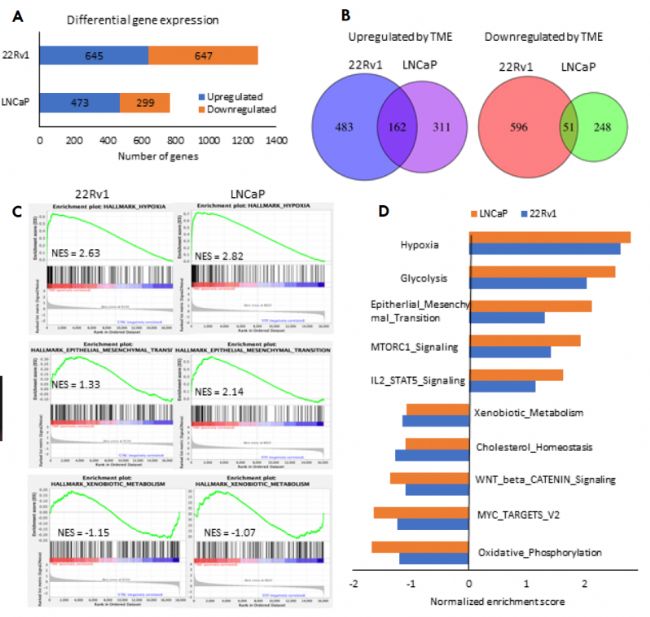 (A)22Rv1和LNCaP細胞在TME條件下基因表達顯著上調(diào)和顯著下調(diào)的基因數(shù)量。(B)22Rv1和LNCaP細胞在TME條件下基因表達上調(diào)和下調(diào)的維恩圖。(C)基因集富集分析(GSEA)繪制了22Rv1和LNCaP細胞缺氧、上皮間充質(zhì)轉(zhuǎn)化和外源代謝的標(biāo)志性特征。(D)22Rv1和LNCaP細胞中顯著富集途徑的GSEA特征富集總譜。