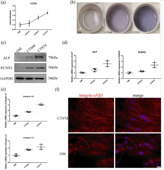 (a)細(xì)胞增殖在 CTS 下 1 天、4 天、7 天。(b )ALP 染色在CTS 下 4 天和 7 天。(c)ALP和RUNX2蛋白表達(dá)在CTS下4天和7天。(d )ALP和RUNX2 mRNA表達(dá)在CTS下4天和7天。(e)整合素αVβ3 mRNA表達(dá)在CTS下4天和7天。(f)整合素 αVβ3 的免疫熒光在 CTS 下 7 天。