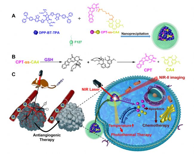 研究內(nèi)容:本文設計并合成了一種基于二酮吡咯(DPP)的小分子DPPBT-TPA,在1000 nm以上具有強發(fā)射能力,在730 nm照射下具有優(yōu)越的光熱性能。然后將DPP-BT-TPA與喜樹堿CA4相連的前藥(CPT-ss-CA4)共封裝在兩親性聚合物膠束中,制備了一個單一激光觸發(fā)的光療平臺,再利用谷胱甘肽(GSH)裂解前藥,釋放化療藥物CPT和血管生成抑制劑CA4。在激光照射下,光熱效應大大加速了這一過程。(Fig.1)