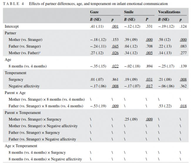 這項研究的結(jié)果表明,在以家庭為基礎的面對面互動中,嬰兒注視陌生人的時間比看父親的時間長,對陌生人的微笑少于對母親的微笑,對陌生人的發(fā)聲也少于對父母的任何一方。氣質(zhì)導致嬰兒與陌生人和父母雙方在發(fā)育過程中交流的個體差異:突發(fā)性較高的嬰兒表現(xiàn)出更多的積極情感和發(fā)聲,而消極情感較高的嬰兒表現(xiàn)出較少的積極情感和視覺參與。盡管嬰兒的情感交流因伴侶而異,但與陌生人的交流模式與每個父母,尤其是父親都有相似之處。