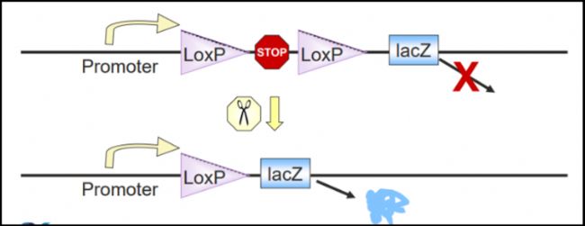 圖3:Cre-lox系統(tǒng)實(shí)現(xiàn)條件性表達(dá)的原理