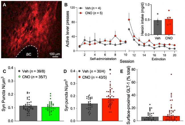 培養(yǎng)的星形膠質(zhì)細(xì)胞上,Gq偶聯(lián)信號(hào)通過(guò)代謝性谷氨酸受體mGluR5促進(jìn)ezrin依賴(lài)的星形膠質(zhì)細(xì)胞突起精細(xì)的運(yùn)動(dòng)。為了確定Gq型mGluR信號(hào)是否會(huì)觸發(fā)線(xiàn)索誘導(dǎo)的星形膠質(zhì)細(xì)胞突起運(yùn)動(dòng),作者在線(xiàn)索誘導(dǎo)時(shí)利用化學(xué)遺傳學(xué)的方法激活NAcore星形膠質(zhì)細(xì)胞,并對(duì)星形膠質(zhì)細(xì)胞的突觸鄰接性和表面近端GLT-1的表達(dá)進(jìn)行了分析。星形膠質(zhì)細(xì)胞激活增加了星形膠質(zhì)細(xì)胞突起與Synapsin I的共定位,但不影響表面近端GLT-1水平。這些數(shù)據(jù)表明,在藥物尋求過(guò)程中,Gq信號(hào)在NAcore星形膠質(zhì)細(xì)胞中能夠觸發(fā)形態(tài)可塑性,而突觸外GLT-1表達(dá)的增加可能涉及不同的信號(hào)級(jí)聯(lián)。