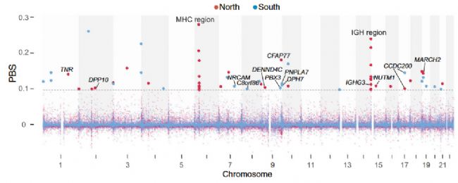 2021年,另一篇針對405個中國人樣本的全基因組納米孔測序研究(深度:~17x),將檢測到的結(jié)構(gòu)變異與其臨床性狀(生化、血液和血清成分等指標(biāo))進行關(guān)聯(lián)分析,發(fā)現(xiàn)14號染色體的22個SV事件與13個表型呈顯著相關(guān)。研究還揭示了中國南北方人在免疫相關(guān)基因上面臨著不同的選擇壓力