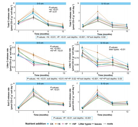 12個(gè)月田間分解試驗(yàn)中,N、P添加處理土壤中的碳(C)釋放率。CK(青綠色)是未施肥對照,+N(橙色)是添加N,+P(亮粉色)是添加P,+NP(綠色)是添加N和P。