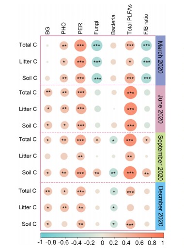 每個(gè)采樣時(shí)間后,N、P添加處理的所有土壤深度的總、凋落物或土壤碳(C)釋放率與酶活性、微生物群落組成之間的Pearson等級相關(guān)性。紅色和藍(lán)色的圓圈分別表示正相關(guān)和負(fù)相關(guān)。