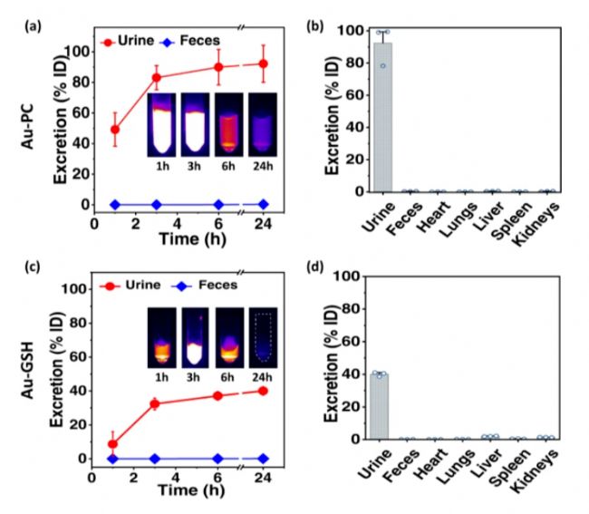 作者將Au-PC和Au-GSH探針相比,觀察到ICG表現(xiàn)出截然不同的SLN引流動力學(圖3c)。ICG信號首次出現(xiàn)在SLN中的時間比Au-PC和Au-GSH的次數(shù)長,并且因小鼠而異,在內側注射后10分鐘-30分鐘的范圍內注射到4T1腫瘤中。與靜脈注射病例類似,腫瘤內注射的Au-PC和Au-GSH探針通過腎臟途徑從體內排泄出來(圖4),而ICG通過肝臟排泄系統(tǒng)排出。在24小時內,對排泄物的ICP-MS分析顯示,約92%的注射Au-PC樣品通過尿液排泄(圖4a,b),而用Au-GSH觀察到僅38%的尿排泄(圖4c,d)。對于Au-PC探針(圖3a),觀察到來自腫瘤注射部位和小鼠身體的接近完全的信號褪色24小時(圖3a),同時在腫瘤注射部位仍然檢測到Au-GSH(圖3b)和ICG探針(圖3c)的顯著信號。與ICG和Au-GSH相比,Au-PC簇在注射部位和體內表現(xiàn)出最小的捕獲和保留,這表明Au簇的高度隱身性歸因于表面磷酸膽堿配體賦予最小的相互作用以及與體內蛋白質,細胞和組織/器官的非特異性結合。