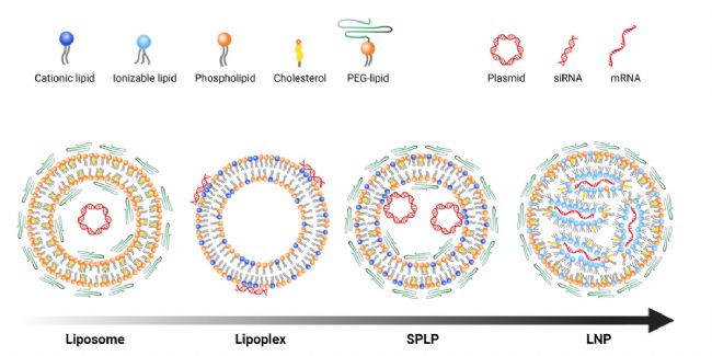 在制備條件一致的前提下,核酸成分及脂質(zhì)占比對(duì)納米粒子的結(jié)構(gòu)有著決定性的影響,從圖4即可看出。了解各類脂質(zhì)的功能是LNP配方優(yōu)化的前提,文中簡(jiǎn)要介紹了LNP常見(jiàn)四種成分的作用,其內(nèi)容多來(lái)自參考文獻(xiàn),文獻(xiàn)題為“The role of lipid components in lipid nanoparticles for vaccines and gene therapy”,如需更深入的了解,可直接查閱原文獻(xiàn)。