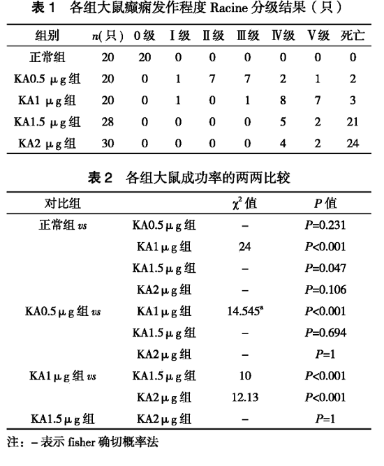 觀察KA致癇大鼠的行為學(xué),并對大鼠癇性發(fā)作強(qiáng)度進(jìn)行驚厥分級,大鼠造模后第1~7天觀察各組大鼠的一般狀況以及Racine分級,記錄動(dòng)物死亡數(shù), 統(tǒng)計(jì)造模成功率。