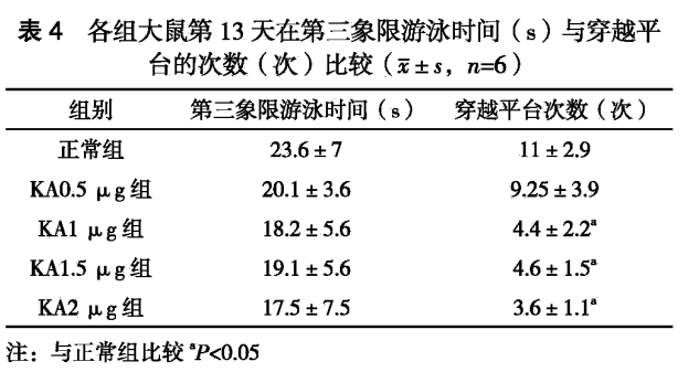 ①與正常組比較,注射不同劑量KA模型組均可導(dǎo)致不同程度的腦損傷,KA 1 μg劑量組的造模成功率高于其他各組(P<0.005)。水迷宮實(shí)驗(yàn)在定位航行實(shí)驗(yàn)中,1 μg以上的各劑量組和正常組比較,第4、5天逃避潛伏期出現(xiàn)明顯的延長(P<0.05),在空間探索實(shí)驗(yàn)中,1 μg以上的各劑量組和正常組比較,穿越原平臺(tái)位置次數(shù)明顯減少( P<0.05 );