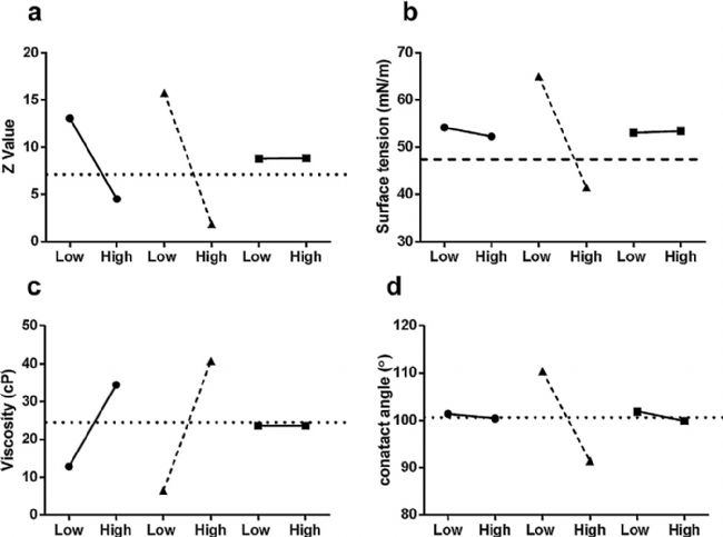 微針孔由PDMS根據(jù)硅陣列母版制成,其中微針尺寸為500μm高,密度為每1cm2含有25個(gè)微針,將含有30%(w/v)脫水海藻糖、0.15%(w/v)剛果紅(用于可視化目的)、含/不含1%(w/w)PVA 13-88的液體溶劑填充到模具微針狀孔中。如圖3所示,其為各種參數(shù)的平均值曲線,(a)Z值、(b)表面張力、(c)粘度和(d)接觸角,(●) 代表海藻糖(▲) 代表PVA和(■) 表示聚山梨酯80。配方1-9為實(shí)驗(yàn)的初步設(shè)計(jì),配方10-11是經(jīng)評(píng)估用于改進(jìn)配方設(shè)計(jì)的額外配方。該表列出了配方組成及其各自的平均表面張力、粘度、計(jì)算的Z值、PDMS上的接觸角、壓電噴射的適用性和模具潤濕的適用性。
