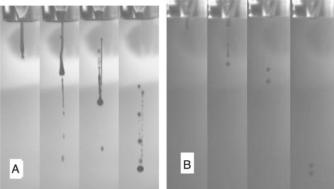 在壓電驅(qū)動(dòng)后50-400µs的時(shí)間段內(nèi),使用CCD相機(jī)的頻閃圖像捕獲技術(shù)捕獲30%海藻糖溶液配方的液滴形成圖像。圖5(a)在高背壓和80V時(shí)下降驅(qū)動(dòng),以及圖5(b)在低背壓和60V時(shí)下降啟動(dòng)。所有液滴均以50Hz的頻率分配。結(jié)果表明,壓電分配是一種可行的技術(shù),用于分配具有粘度和表面張力值范圍的液體制劑配方。