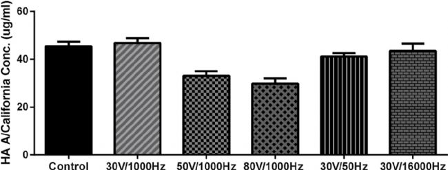 如圖6所示,在不同電壓(30V、50V和80V)和頻率(50、1000和16000Hz)下分配之前和之后,通過SRID分析檢查30%(w/v)海藻糖和1%(w/v)聚乙烯醇配方中季節(jié)性流感疫苗的生物完整性,結(jié)果證明了壓電噴墨技術(shù)制備三價(jià)滅活的亞單位流感疫苗的可行性。