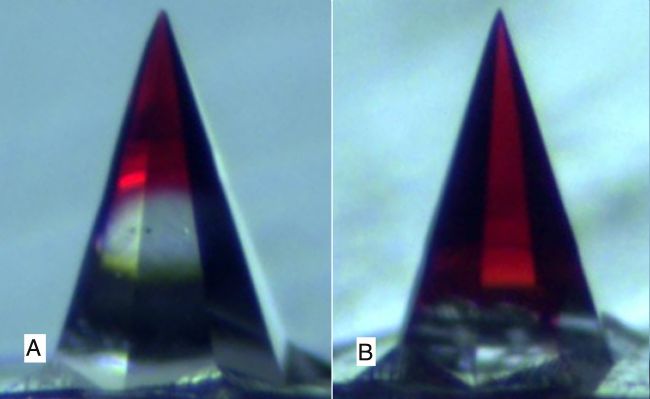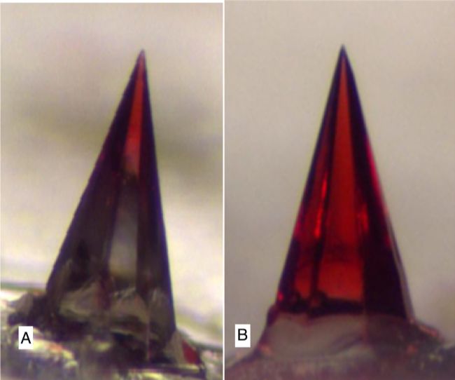 為了證明壓電噴墨技術(shù)可以精確控制液體制劑用于雙層DMN制造,通過將30%(w/v)海藻糖和1%(w/v)PVA的液體制劑到摸具中來制備雙層DMN ,以創(chuàng)造DMN尖端(圖7和8)。將剛果紅添加到這些配方中,以使尖端配方與制造的DMN中的背襯層形成對(duì)比。結(jié)果表明,雙層DMN可以成功地使用壓電噴墨技術(shù),且該技術(shù)可以精確的,有針對(duì)性的分配,使雙層DMN可控制造。