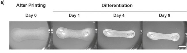 作者使用瑞士regenHU生物3D打印機3DDiscovery的電磁閥噴墨打印頭完成主要的打印工作。相比于經(jīng)典的擠壓打印方式,微型電磁閥噴墨能夠有效減少打印時的剪切力,提高細胞存活率。因使用的基質(zhì)膠(Matrigel)具有低溫流動,高溫凝固的特性,因而在打印機上搭配了水循環(huán)制冷系統(tǒng),確保打印材料在低溫(<10℃)環(huán)境下噴出。使用的生物墨水分散有原代人肌肉前體細胞,打印后培養(yǎng)一周形成可收縮、有紋理的肌纖維,即獲得了體外骨骼肌模型。期間可觀察到模型體積縮小,表明肌肉細胞產(chǎn)生拉力(圖1)。