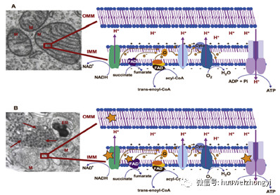 圖1.線粒體呼吸鏈和氧化磷酸化:(a)人肝細(xì)胞的電子透射顯微照片,顯示線粒體(M)帶有電子致密cr。(b)感染登革熱病毒的人類肝細(xì)胞的電子傳輸顯微照片(電子致密顆粒;箭頭)。病毒顆粒(紅色箭頭)位于線粒體(M)和內(nèi)質(zhì)網(wǎng)(ER)附近。[YL1]