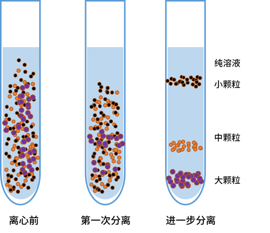 分離步驟 第一步:設(shè)置較低的離心速度(相對離心力),先讓較大的顆粒沉降到管底,而混合液中小的顆粒仍然懸浮在上清液中。